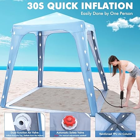 - 30s Effortless Inflation – Set Up Your Beach Canopy Instantly! Forget struggling with poles and complicated instructions! With our patented one-piece inflatable frame, a single person can fully set up this beach sun shade canopy in just 30 seconds using the included high-pressure air pump. No more 2-3 people, 20-minute setups—just quick, effortless shade. Spend more time soaking up the sun, enjoying the ocean breeze, and making unforgettable beach memories!