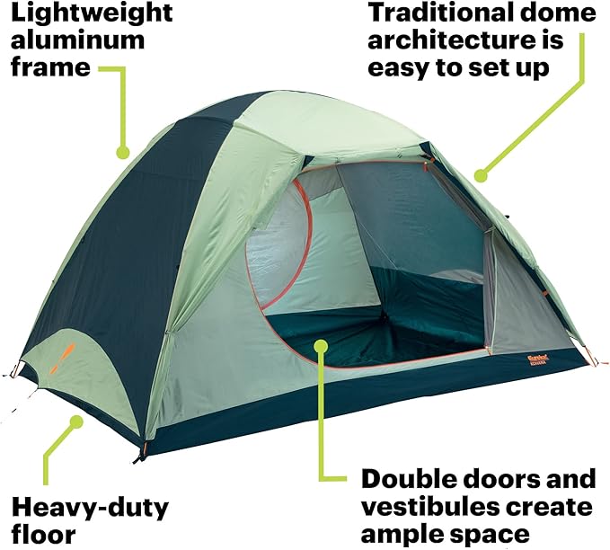 - The stable, two-pole dome tent sets up quickly and includes two doors for easy entry and exit, a full coverage fly for complete weather protection, and two vestibules for storing gear and keeping wet shoes and clothes out of the tent.