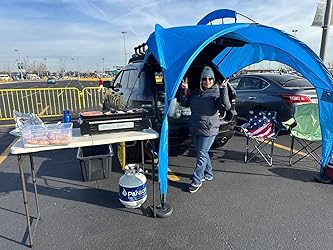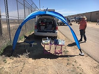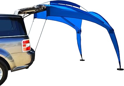I sell at a flea market on weekends with my ’99 Ford Explorer parked with the hatch open behind my tables. It took me a while to discover how to attach it, even with the help of other people at the market. I went home the first day, read the instructions more carefully, and figured it out. It’s actually pretty easy and fast to put up, by myself or with a helper. It gives a bit of nice shade if we’re sitting on the tailgate. Sitting in front of the tailgate, depending on the sun, it still gives some protection. It’s not big enough to put a table under without positioning the table right next to the bumper, so it doesn’t work for that. I can set up a couple of lawn chairs and a cooler underneath, between my tables (out in the open) and the vehicle. I’m happy enough with it, but the round disks you fill with sand to hold the front posts are not heavy enough to hold it down even in a mild wind. They slide around, then the aluminum poles come out and the thing collapses. So for a hot, non-windy day, it works well enough and it looks good — I get lots of compliments and curious questions. In mild wind it is unstable.