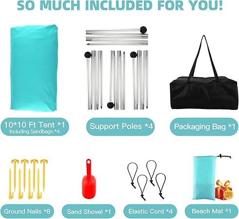 Enjoy sun protection with our 10×10 FT Beach Tent! UPF50+, complete with poles and blanket. Perfect for family beach trips—order now!