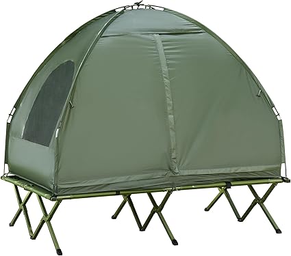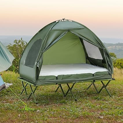 - Camping Combo: This multifunctional portable camping set includes an off the ground tent, 2 person cot, air mattress with pump, and bedspread. Both the tent and the camping bed are foldable, which greatly saves space when not in use. Multifunctional bag for easy carrying and storage.