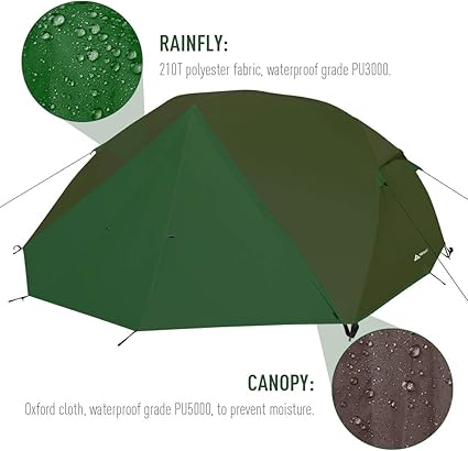 - Moisture-Proof and Waterproof: 3 seasons camping tent!The rainfly is made of 210T Polyester fabric with PU coating,and water pressure resistance index reaches PU3000.The floor is made of PU5000 oxford cloth with PU coating.To ensure water resistance, the corners of the floor have been thickened.All of these materials can keep the inside of the tent dry in rainy or humid environments.