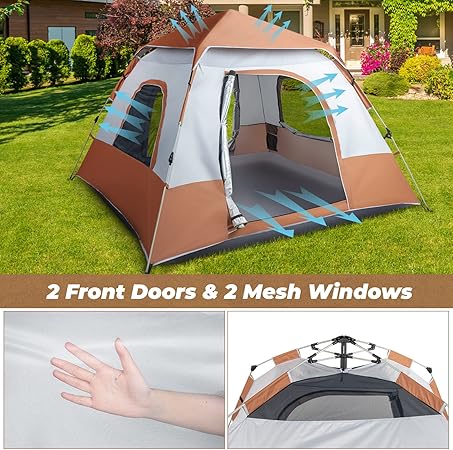 Four-Person Family Camping Tent Quick Opening in Brown Color
