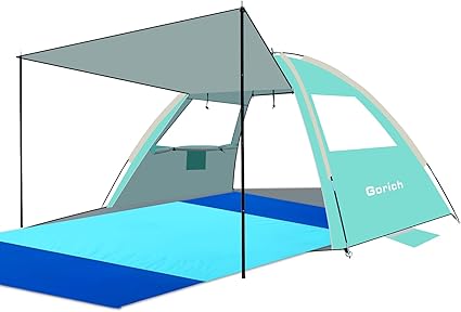 “Enjoy the sun safely with the Gorich Beach Tent! Easy setup for 3-6 people, UPF 50+ protection, and extra-large waterproof blanket. Order yours today!”