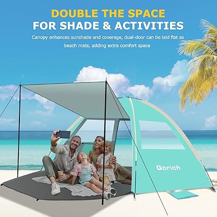 - Wide Space Canopy Tent: Gorich Beach Tent features a dual-door design with a canopy, doubling the shaded space and movement area. Open the doors to convert them into two beach mats for extra activity space. When the sun is strong, just prop up the canopy to get a larger shade area. Ideal for beach outings, camping, parks, and lakeside trips. Size: 102.4″L x 65.0″W x 59.1″H (4-person model)