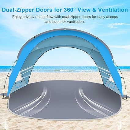- Enhanced Visibility & Ventilation with 2 Doors: This tent features dual zippered doors and 2 mesh windows, providing 360° panoramic views and superior airflow from all four sides, keeping you cool and comfortable. The pull-down doors act as 2 extension floors, creating more sand-free space for beach play. When you need privacy, simply zip them up for a cozy, enclosed space.