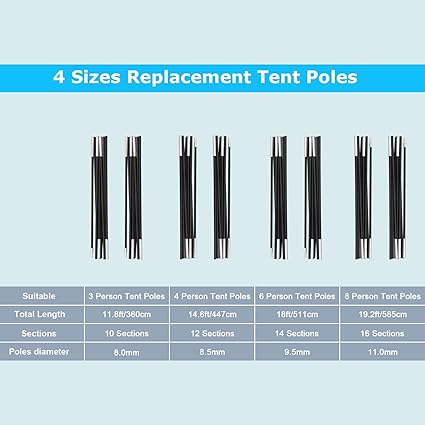 - WE CARE ABOUT EVERY DETAIL – Made of the highest quality 8.0mm IMPORTED fiberglass frame and durable elastic cord, this tent poles replacement can take the bends better than many cheaper poles which would crumple or snap easily. Every Pole Sections are carefully handled for smooth connection between pole sections for your really quick set-up/takedown.
