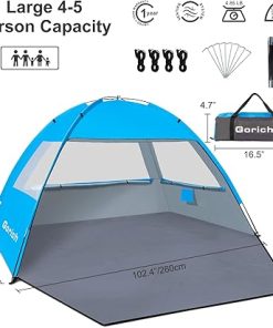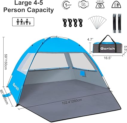 - Spacious Space: Measuring 102.4″L x 65″W x 59.1″H, Gorich beach tent boasts a 45% larger area compared to others in its price range, comfortably fits 4-5 people. And the beach mat is 10’×9′ FT, offering over 81 square feet of sandless space, ensuring ample room for all your beach supplies and family members to lounge and relax in comfort.