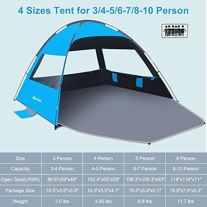 - Spacious Space: Measuring 118″L x 118″W x 71″H, Gorich beach tent boasts a 45% larger area compared to others in its price range, comfortably fits 8-10 people. And the beach mat is 10’×9′ FT, offering over 81 square feet of sandless space, ensuring ample room for all your beach supplies and family members to lounge and relax in comfort.
