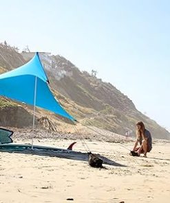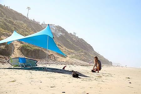 - DESIGN. Beautifully Designed in Southern California; Corner anchor bags to be weighed down with sand or rocksMATERIALS. 9×9 high quality Nylon/Lycra blend main tent fabric; Patented Reinforced Corners for long lasting; Rust-proof Aluminum Poles; 7 feet tall!LIGHT & PORTABLE. Easy to Carry. Weighs Only 6.5 pounds! 19.5 inch shoulder carrying bag that Fits in a Carry-on Suitcase. Includes a Cooler Pocket for your drinks and snacks!UPF 50+ PROTECTION