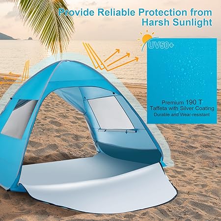 - 【190T Polyester & UPF50+】Our sunshade tent is made of high quality 190T polyester taffeta with silver coated, which provides strong UPF50+ sun protection and leaves you no worries about harmful sun rays. Moreover, the sun shade is waterproof and windproof, suitable for light rainy weather and windy days.