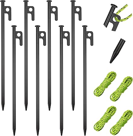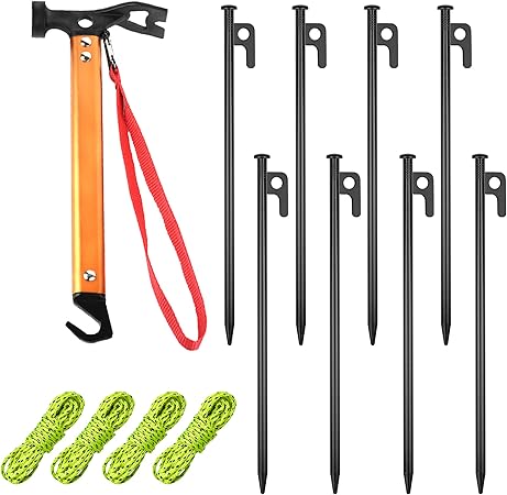 - 【Set Includes】8 metal steel tent hooks (12 inches long / 5.7oz each), a tent stake hammer and four complimentary 1 meter long windbreak ropes (Style free at random). Your pile can be in rocky places, deserts, snow and grasslands.