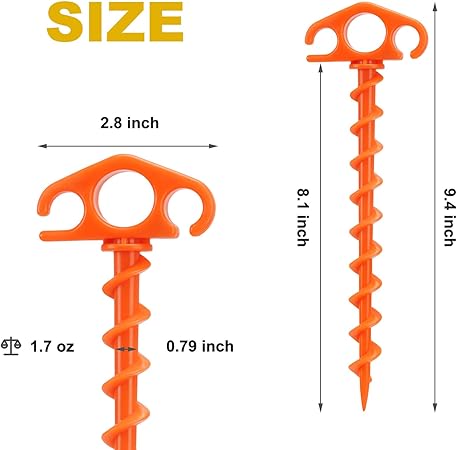 Tested these on the beach in 20 plus mph winds. Light weight thoughtful design. Easy to screw into sand. Multi useful top area good for tying a rope (closed circle), hooking on a closed loop (open circle) or bungee, You can insert a second stake into the top sideways to assist rotation. Wide top has a flat bottom that you can smash down or wedge on equipment to hold it in place without a tie down. Beach chairs, shelters, kites, blankets & games stayed put. Blue color makes it easier not to lose them in the sand. I wish these came in orange. So many uses that you never knew you needed stakes for. Highly recommended & I suggest you buy the larger quantity. Included carry bag was a nice bonus I didn’t expect. Only con for handling & packing- the tips are quite sharp, but maybe that’s a good thing.