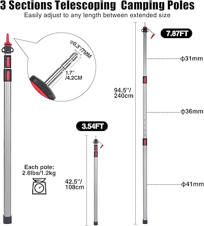 - Adjustable Height: This 3-section telescoping tarp pole can be extended up to 94.5”/240cm and as compact as 42.5”/108cm. With our reliable locking mechanism, this portable telescoping pole can be securely locked at the height you need according to your requirements.