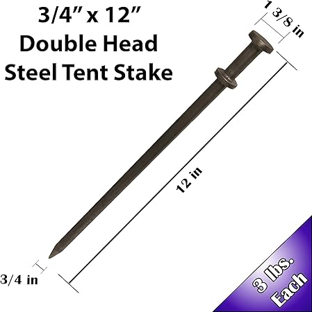 - METAL TENT STAKE DIMENSIONS: Each of our metal tent stakes heavy duty measures 3/4 inch in diameter, are 12 inches long, and have 1-3/8 inch wide head to accommodate a wide variety of straps and rope.