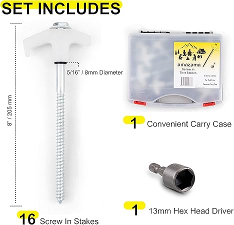 - SCREW IT HOME: When you need absolute staying power, call on these amazama screw-in ground stakes no matter the occasion – from a campout to a dog tie-out to a garden anchor. These 8” stakes with glow-in-the-dark heads go in and come out with surprising ease but stay grounded for the long haul.