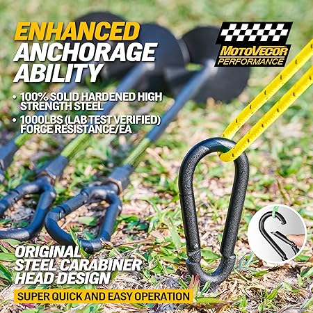 - [Detachable Carabiner Configuration]: The distinctive carabiner configuration enhances the efficiency of rope attachment and detachment. These durable stakes excel at providing security for a variety of applications, including tents, tarps, canopies, and dog tie-outs.