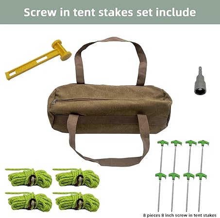 - Screw in tent stakes set include:8 pieces 8 inch screw in tent stakes with Grow in The Dark Heads、1 Hex Head Driver connecting electric drill and tent stakes、Four 4-meter luminous ropes、1 Handheld tent stakes bag、1 hammer with the function of pulling up