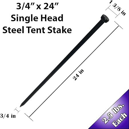 - METAL TENT STAKE DIMENSIONS: Each of our metal tent stakes heavy duty measures 3-4 inch in diameter, are 24 inches long, and have 1-3/8 inch wide head to accommodate a wide variety of straps and rope.