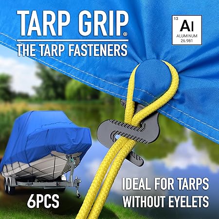 - STAYS FIRMLY IN PLACE. Tarp Grip provides a strong grip on any fabric without causing any significant damage to make sure they don’t affect the lifespan of your covers or tarps. The shape is designed to offer a more stable occlusion between the tarp and grip unit, so it doesn’t loosen even during strong winds. NO knots are needed. Ideal for tarps without eyelets