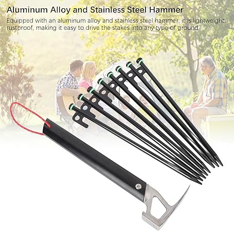 - 【Aluminum Alloy and Stainless Steel Hammer】: Equipped with an aluminum alloy and stainless steel hammer, it is lightweight, rustproof, making it easy to drive the stakes into any type of ground.