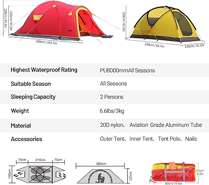 - 【Tent Size】 Inner tent size is 82.7”L*51.2”W*43.3”H,The outer tent size is 141.7”L*55.1”W*45.3”H,ccommodates 2 people.The space is larger and more spacious than conventional tents, with plenty of space.There are extended halls in the front and rear, and a 29.5-inch large storage space in the front and rear halls. The front hall is supported by aluminum rods, which increases the height space and allows unrestricted activities inside.