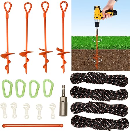 - 𝗖𝗢𝗠𝗣𝗟𝗘𝗧𝗘 𝗚𝗥𝗢𝗨𝗡𝗗 𝗔𝗡𝗖𝗛𝗢𝗥 𝗦𝗘𝗧: Includes four durable anchors, lightweight 200 lb capacity ropes, eye hook rope buckles, glow-in-the-dark carabiners, a drill attachment, and a sturdy canvas bag. Sturdy and Weather-resistant, providing reliable stability for tents, canopies, tarps, and even pets.