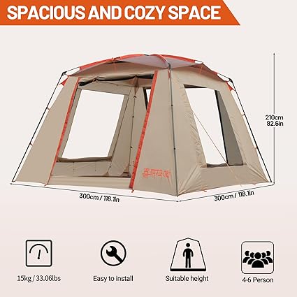 - 【Tent Size】 Outer tent size is 118.1”L*118.1″W*82.6”H, accommodates 4-6 person.