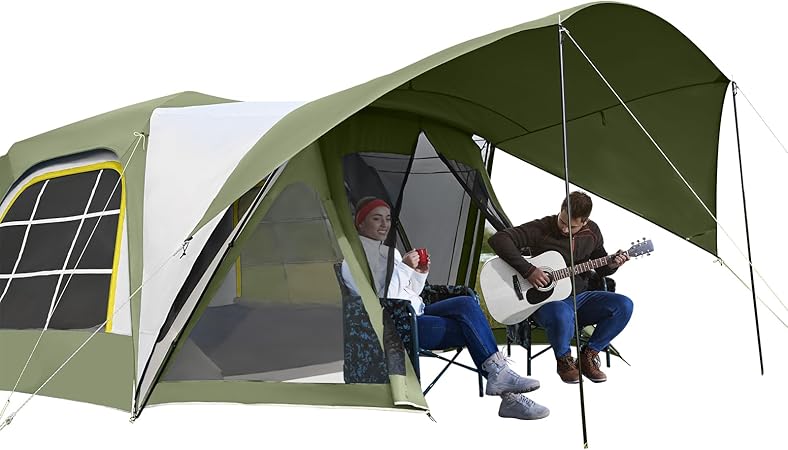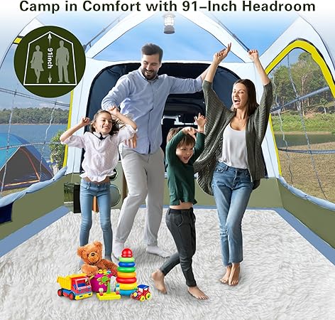 - Spacious and Comfortable Interior: Step into a world of comfort and relaxation with our generously sized tent attachment. With nearly 10×10 feet of space, it comfortably accommodates 2 queen-size air mattresses and up to 6 people, ideal for families and friends. Enjoy panoramic views and excellent ventilation through the top full mesh skylight and three large mesh windows, creating a cozy and airy atmosphere.
