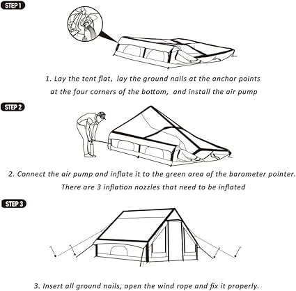 - Package Includes – Inflatable Tent*1, Storage bag*1, Manual air pump*1, Ground nail*4, Wind rope*4.
