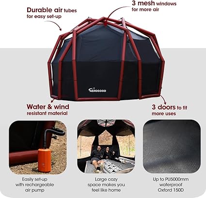 - Comfortable Ventilation – This blow up tent has 3 doors and 3 mesh windows for extra space, ventilation, and sun protection.. This inflatable tent stands out from traditional air tents. It offers PU5000mm waterproofing and UPF 50+ sun protection