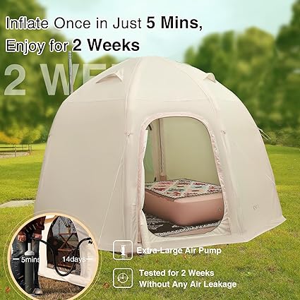 - Set Up in 5 Mins with No Hassle: Say goodbye to the hassle of traditional tent setup! Our inflatable glamping tent can be effortlessly inflated in just minutes using the included air pump, no worries about missing or damaged parts