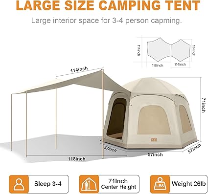 - 【SPACIOUS AND COMFORTABLE】:This pump up tent measures 114x114x70.8 inches when unfolded and can easily accommodate 3-4 people. We also provide an easy-to-carry storage bag with storage dimensions of 28.4x14x12.8 inches and a weight of 24 pounds, designed for family camping.
