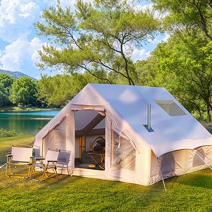 - ⛺【Two doors Two Windows Inflatable Tent with Stove Jack】 are designed with two layers, one layer is airtight and one layer is mesh. The door and windows can be rolled up so you can choose to open them or not depending on your need. Mesh windows and door can enhance the breathability and mosquito prevention. Not only protect privacy but also keep you cool and comfortable on hot summer days. A stove jack allows you to use the stove in the tent. The Camping tent has 1 roof vent for ventilation.