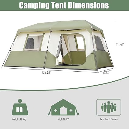 - 【Roomy for family of 8 Person】camping tent is one of the perfect family tents you have ever seen. The size is 13*9*6(H)ft. 2 queen air mattresses or 8 sleeping bags are well fit in the tent. Ideal for family car camping or camping site