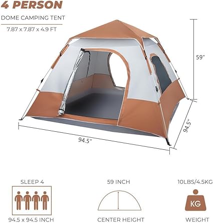 - Roomy 4 Person Tent: With the unfolding size of 240*240*150cm (94.5*94.5*59.1in), the tent is spacious for 4 adults. Weigh only 4.5kg (9.9lb), it can be stored in to the 94*22*22cm (37*8.7*8.7in) carry bag. Super easy to carry it everywhere.