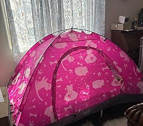This twin size kids cozy tent was $15 to $20 less than all the other tents of similar size and style. It is made of polyester/nylon just like the others, can be used indoors or out and comes with tie down stakes, for outdoor use. Goes up and down in minutes. Fit beautifully over a convertible ottoman (small twin size). Makes a bed into a cozy kid’s hideaway. Zipper-Door also has a screen door for locking out the pests while keeping air flow. Has rain cover and carry case. Very easy to put together and it has a hook sewed to inner ceiling to hang a light or small fan! 8 y.o. Is very happy with her “cozy tent”. Comes in pink or blue with dogs & cats, very cute and appropriate for girls or boys. Spacious enough for 2 kids to play in, two kids, or one parent with a young (small) child for sleeping. Set up time: 20 minutes with kids help, 5 minutes alone! Seems sturdy, as long as kids don’t mess with frame. We’re very happy with the purchase.