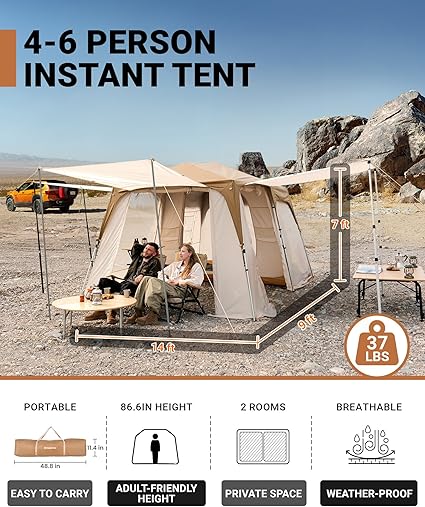 - 【Instant Cabin Tent Easy Setup】Pre-attached poles and innovative pop-up technology make setting up this tent a breeze, so you can spend less time assembling and more time enjoying your outdoor adventure.