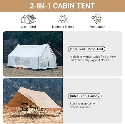- 【2-in-1 Cabin Tent】Tent Tarps–canopy: windproof & rainproof, canvas tent protects you from extreme weather(rain or sun); Inner tent–mesh tent: Increase airflow mobility. You can lie comfortably in the camping tents and enjoy the starry sky or white clouds.