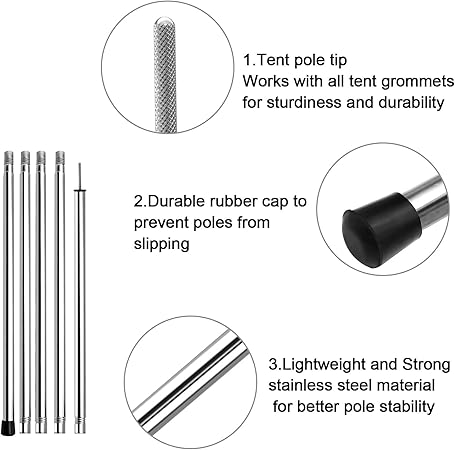 - Stable Design – Our tent poles are installed step by step by rotating fastening, easy to install. The diameter of the tent pole is 11MM and the size of the top is 5cm/1.96inch,which is suitable for most tent grommets. The bottom of the tent pole is installed with a non-slip base, which increases the friction between the pole and the ground and reduces slippage.