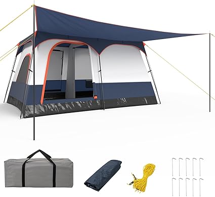 - [Spacious Interior & Sleeping Capacity]: Designed for group adventures, this 12.5’ x 8.5’ x 6.3‘ family-sized tent comfortably accommodates 6 sleeping bags or 2 queen-size air mattress, providing a peaceful night’s sleep for 6-8 people. With a 75-inch center height, this big outdoor tent offers full-standing mobility—no more hunched movements.