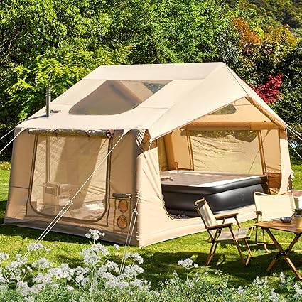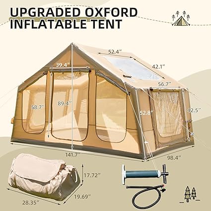 - 【EXCELLENT LIGHTING & VENTILATION】-This blow-up tent has two oversized skylights for added brightness and viewing inside the tent.The addition of two adjustable air conditioning inlets and outlets and the design to fully open the tent on all sides, together with the high-density mesh screen doors and windows, increase air circulation while protecting privacy and keeping you cool and comfortable in the hot summer.