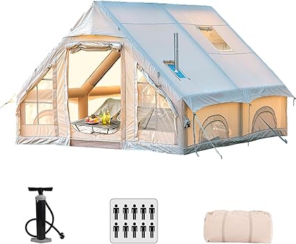 - 【4 Seasons Inflatable Tent Cabin】This is a hot tent with a stove jack, allowing you to safely use the wooden stove to warm up or cook inside the tent during the cold winter. It is also a glamping tent with 2 skylights, allowing you to enjoy the beautiful starry sky and charming natural scenery on a peaceful summer night.
