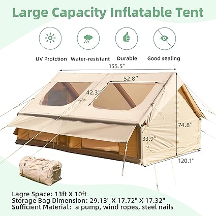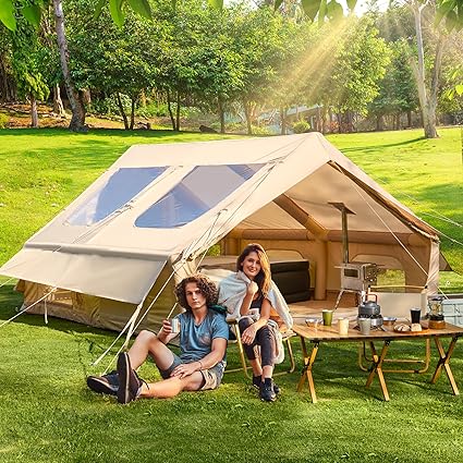 - 【EXCELLENT LIGHTING & VENTILATION】This blow-up tent has two oversized skylights for added brightness and viewing inside the tent.The addition of two adjustable air conditioning inlets and outlets and the design to fully open the tent on all sides, together with the high-density mesh screen doors and windows, increase air circulation while protecting privacy and keeping you cool and comfortable in the hot summer
