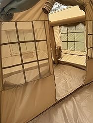 - 🏕️【Triple-layer Doors & Windows】-The tienda de campaña inflable with three doors Three Windows & Two skylights,Three layers, one layer is Oxford ,One layer is mesh.One layer is PVC .Mesh windows and door can enhance the breathability and mosquito prevention. Not only protect privacy but also keep you cool and comfortable on hot summer days. A stove jack allows you to use the stove.The tent inflatable has 1 roof vent for ventilation.