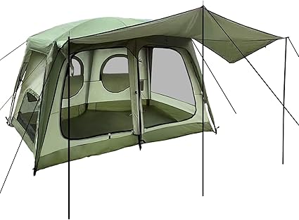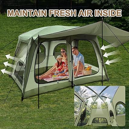 - [VENTILATION AND BREATHABLE DESIGN]: There are breathable mesh windows around and above the large tent for outdoor camping. The front is designed with double doors for easy access, and the side is designed with side doors to provide optimal ventilation and ensure comfortable and dry indoor conditions
