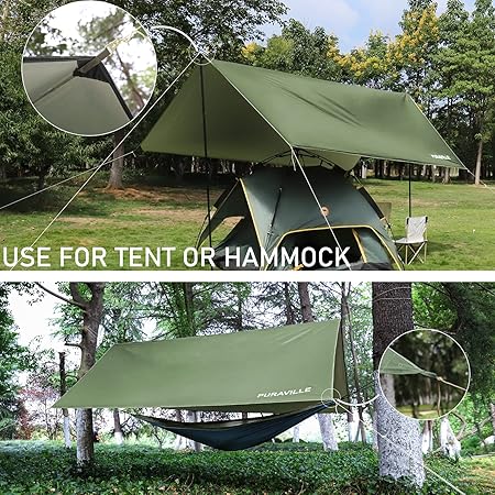 - Waterproof : Puraville camping tarp rain fly is made of super solid 210D rip-stop polyester, combined with PU 3000mm waterproof coating and leakproof-taped seams technology, which could effectively protect your camping gears from rainy or snow days. Fixed with six wind-resistant steel stakes, you can set up a safe campsite in minutes without need to worry its security