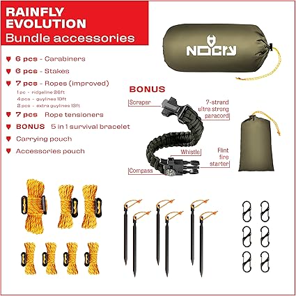 Included Components | 1 rainfly tarp, 6 aluminium stakes with orange reflective paracord ties, 6 carabiners, 7 adjustable ropes, 1 sack for the ropes and poles, 1 carrying pouch for all your gear, 1 survival bracelet |