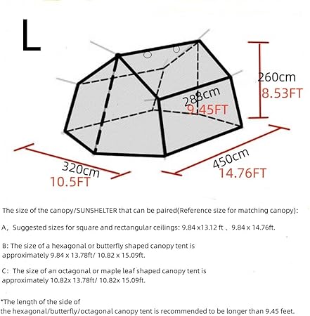 - Medium size: 14.43 x 9.18 x 6.89ft;The size of the canopy that can be paired(Reference size for matching canopy): 1,Suggested sizes for square and rectangular ceilings: 9.84 x13.12 ft 、9.84 x 14.76ft. B: The size of a hexagonal or butterfly shaped canopy tent is approximately 9.84 x 13.78ft/ 10.82 x 15.09ft. C:The size of an octagonal or maple leaf shaped canopy tent is approximately 10.82x 13.78ft/ 10.82x 15.09ft.