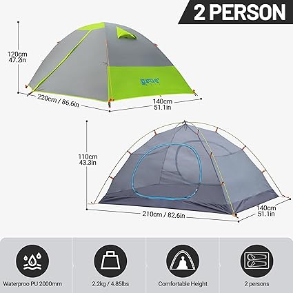 - 【High Quality Material】 Outer tent is made of 210T polyester, PU2000mm fabric, and the inner tent is made of nylon mesh. The floor mat is made of wear-resistant Oxford cloth, 150DPU5000mm. 8.5mm aviation aluminum poles are used for the stand.